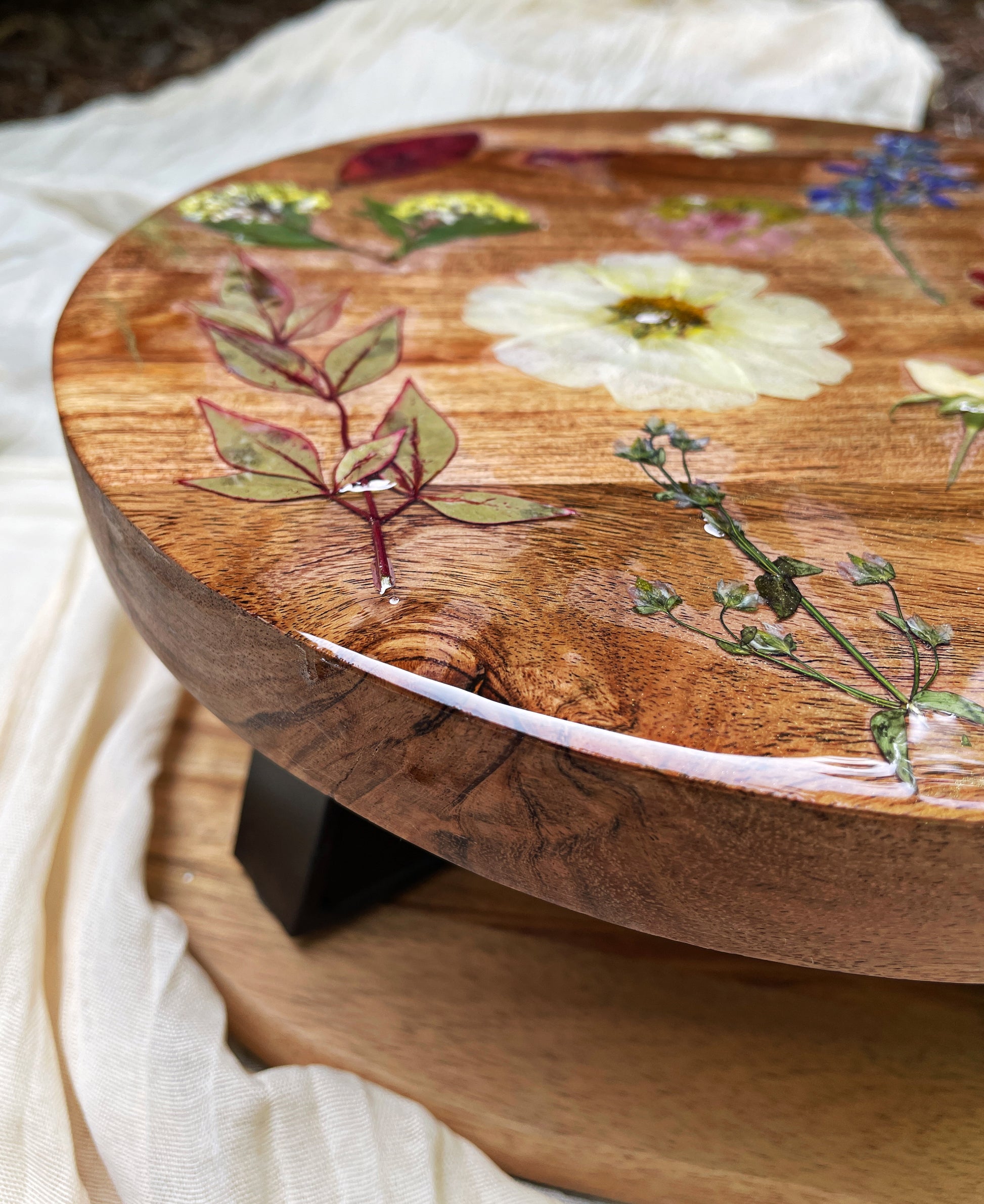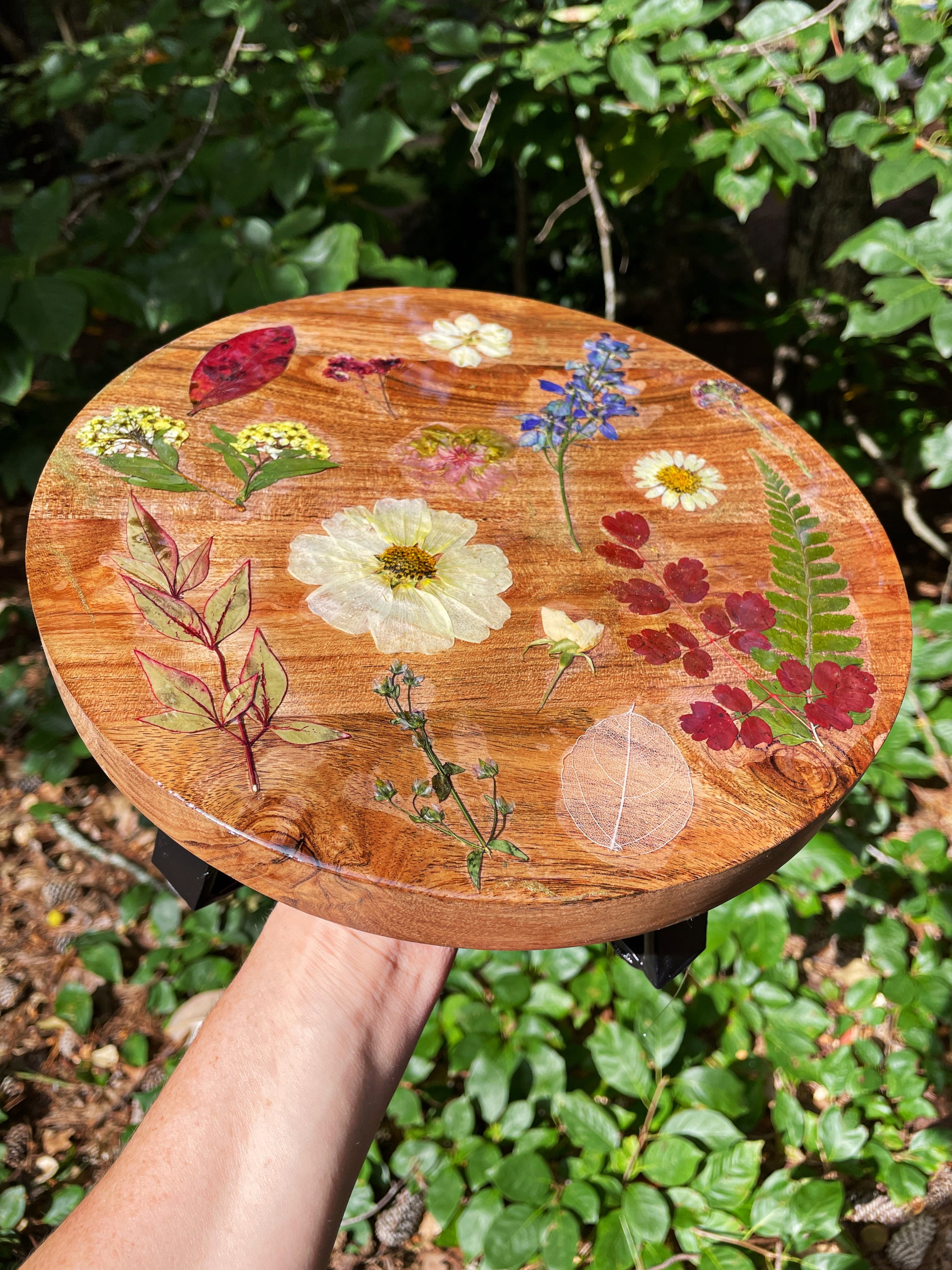 The wooden surface is thoughtfully crafted and adorned with hand-pressed autumn florals, capturing the rich hues and delicate textures of the season. This intricate botanical design brings warmth and seasonal charm to the piece, making it perfect for displaying appetizers, desserts, or decorative accents. Combining durable materials with artisanal detail, this elevated stand is a versatile and stylish addition to any home.