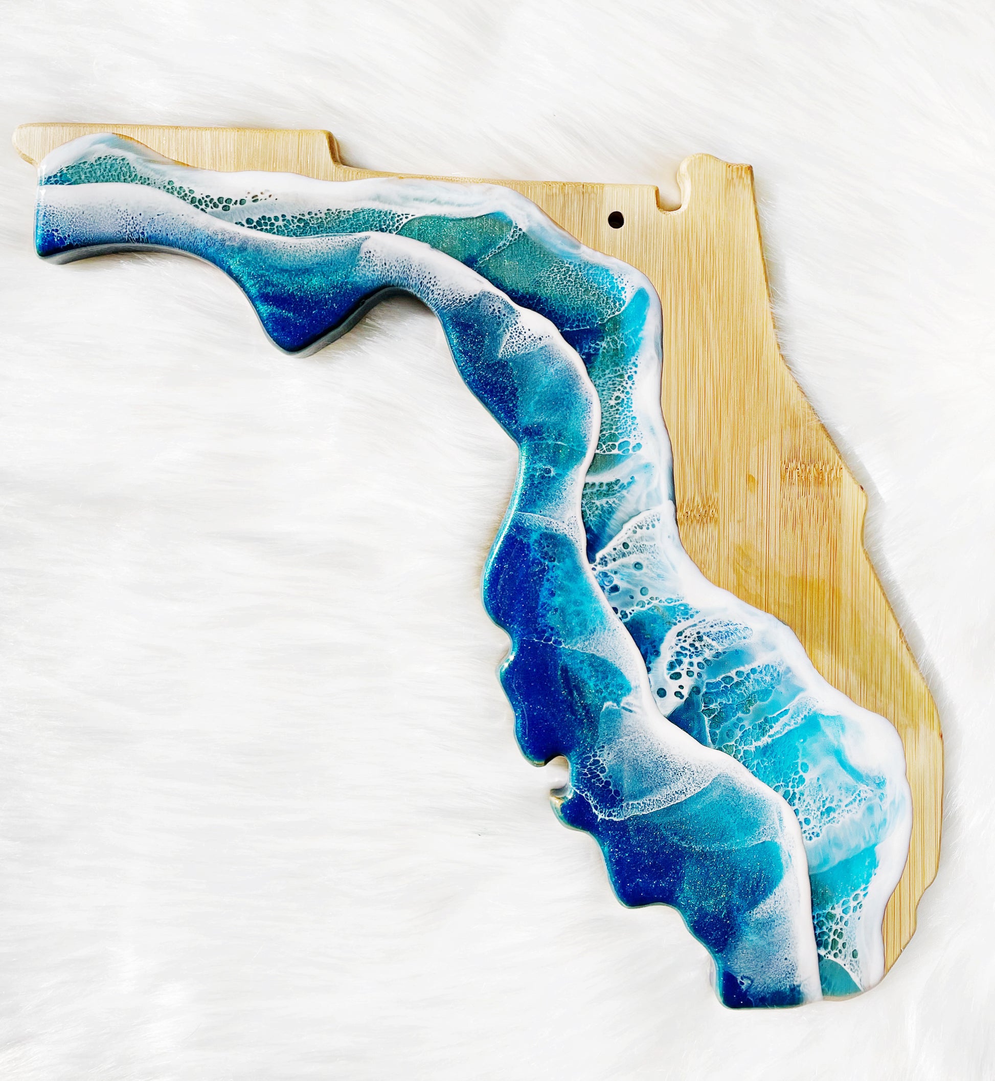 Bring a piece of your heart into your kitchen with a handcrafted, ocean-kissed cutting board from Sam + Sea Artistry. Each board is carved into your chosen home state and finished with my signature shimmering ocean epoxy—an artful blend of coastal blues, seafoam greens, and soft pearlescent waves that reflect the movement of the shoreline.