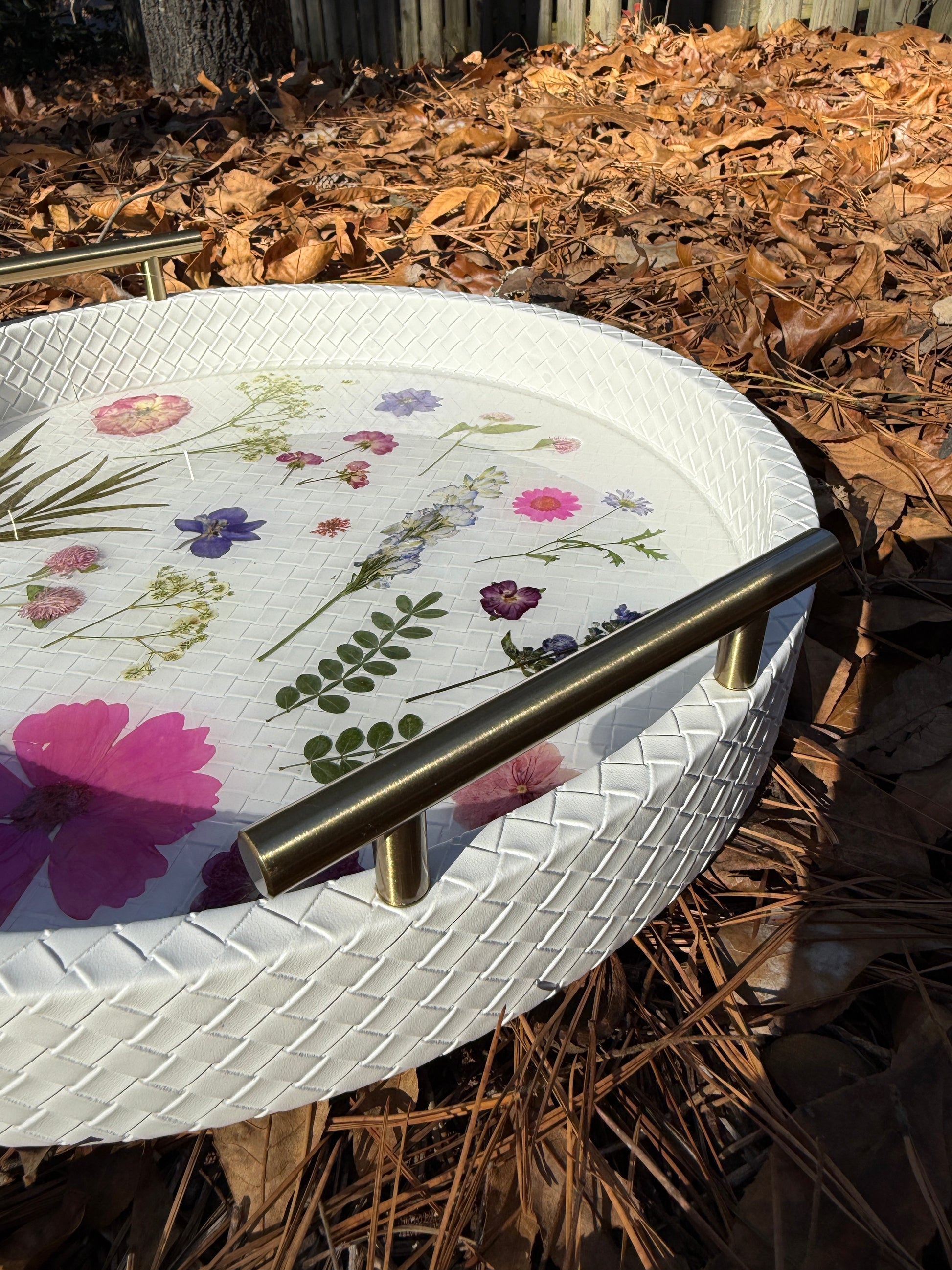 Soft, romantic, and thoughtfully handcrafted, this white woven pressed flower tray brings a touch of nature’s poetry into your home. Real pink and white florals are carefully pressed and preserved beneath a smooth, crystal-clear resin surface, creating a timeless design that feels both delicate and enduring.