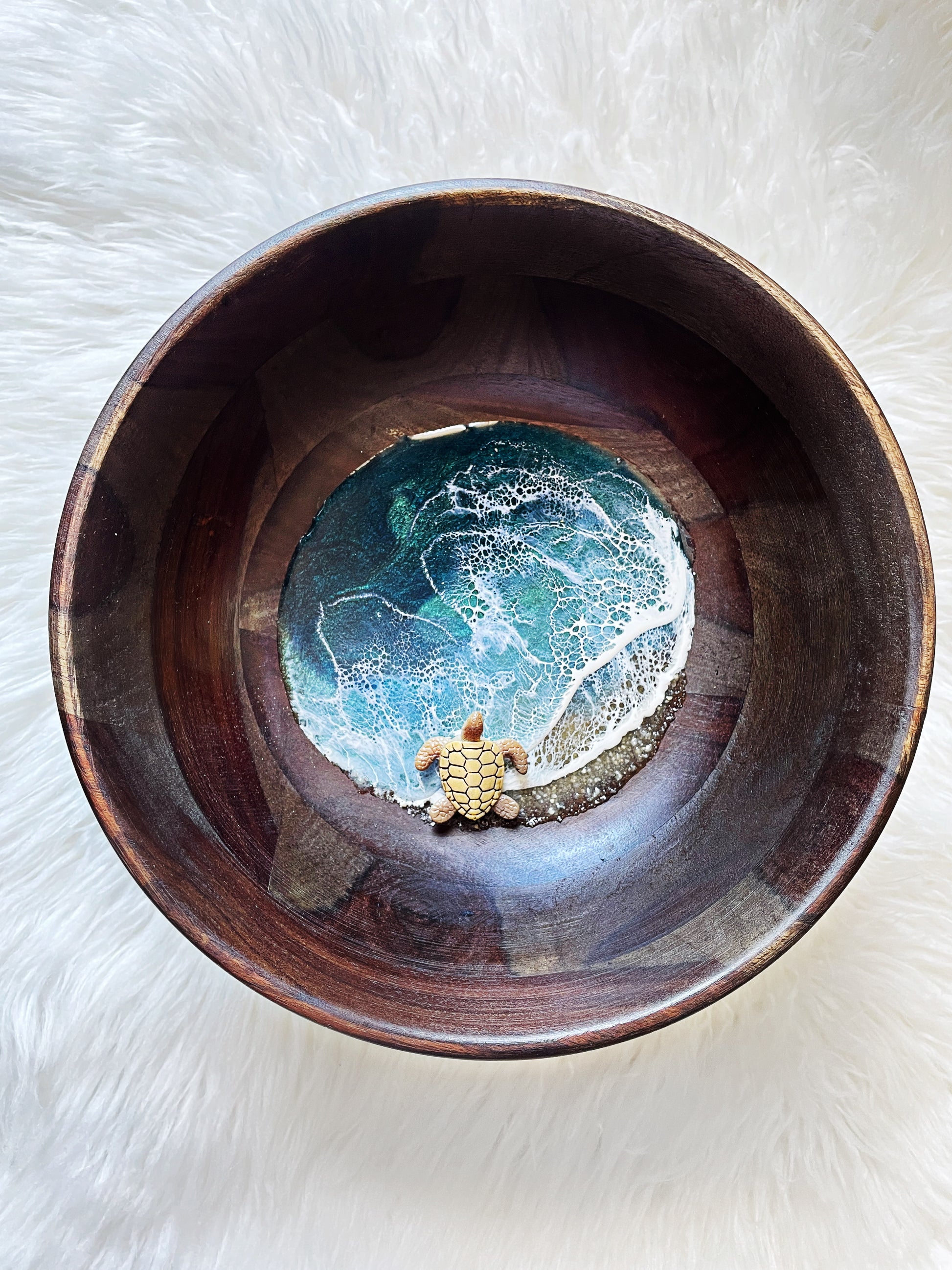 This 10" x 6" solid wood bowl with a pedestal base is a true statement piece, blending natural beauty with coastal artistry. Designed with real sand, shimmering emerald resin waves, and a charming hand-painted sea turtle, it brings the serenity of the ocean to your tabletop. Perfect for holding decor, fruit, or simply standing alone as a work of art.